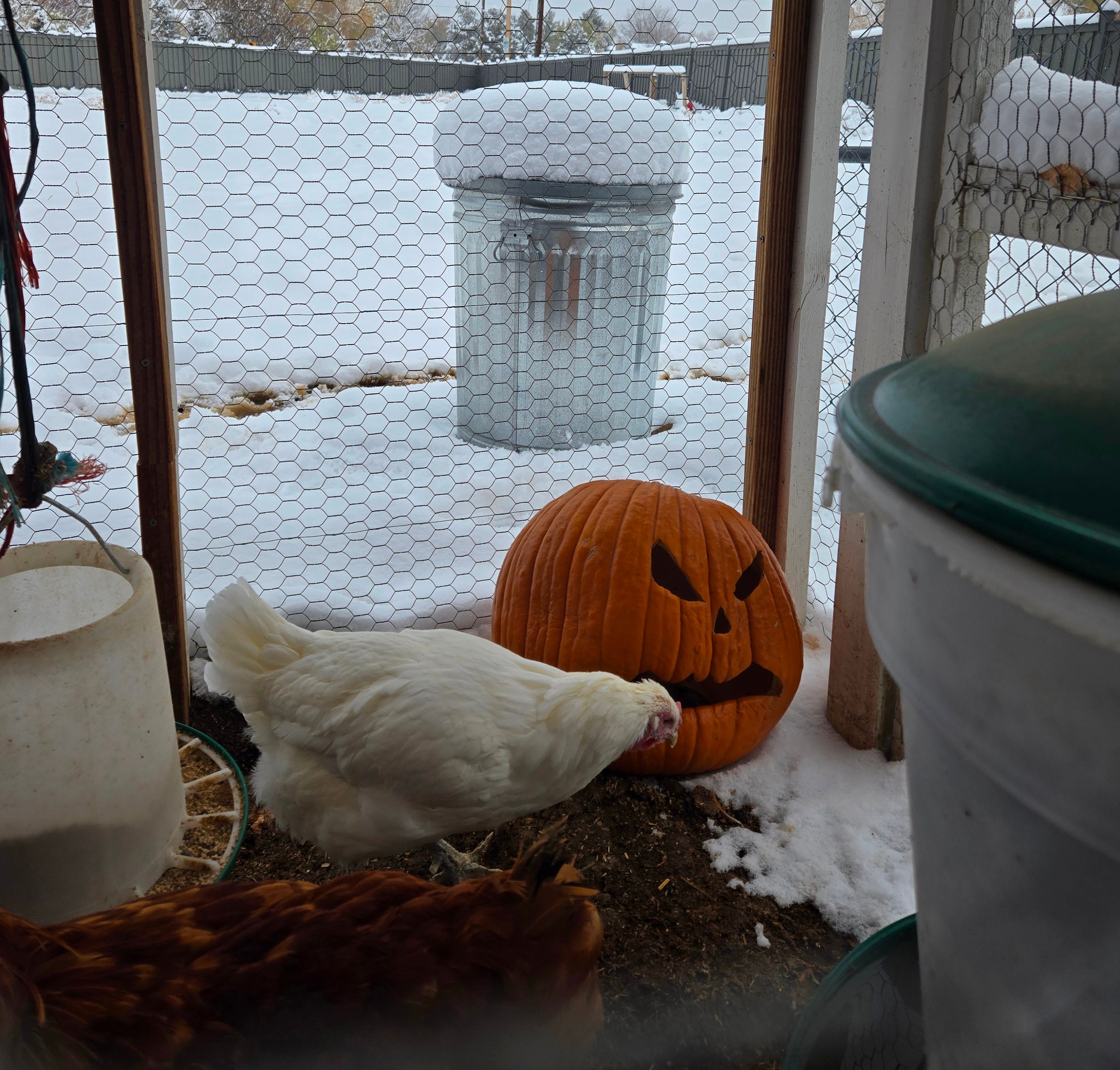 It meant taking her to bring our molding jack-o-lantern to our chickens.